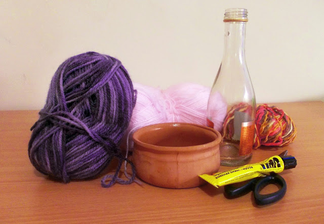 Put some glue vertically, in a few points of the vessel. Start from the bottom and put the thread around the vessel or the bottle. Continue putting the yarn around and stop when the vessel looks as colorful as you want.
