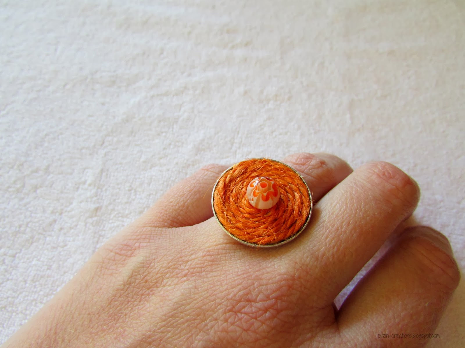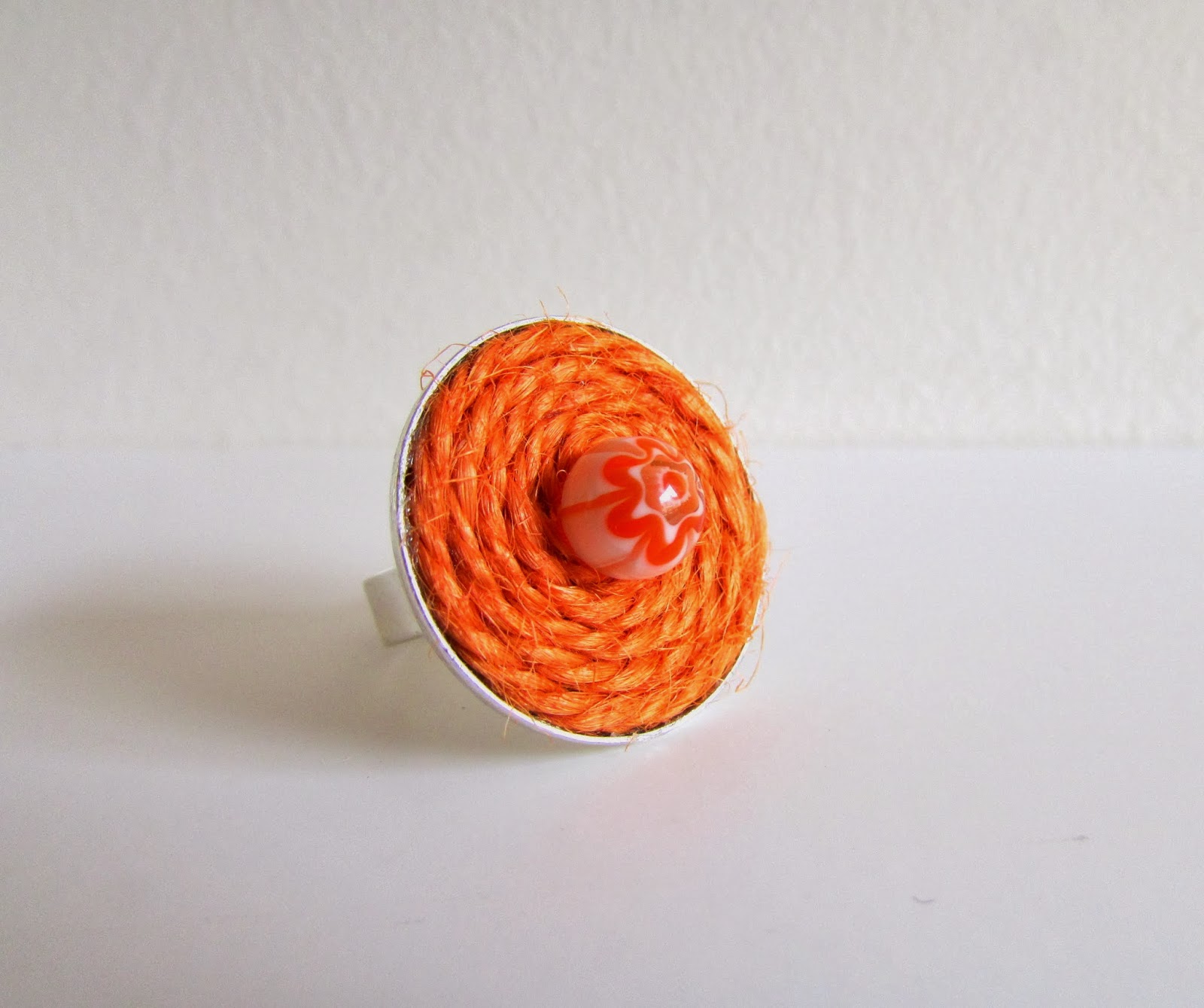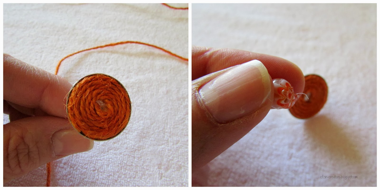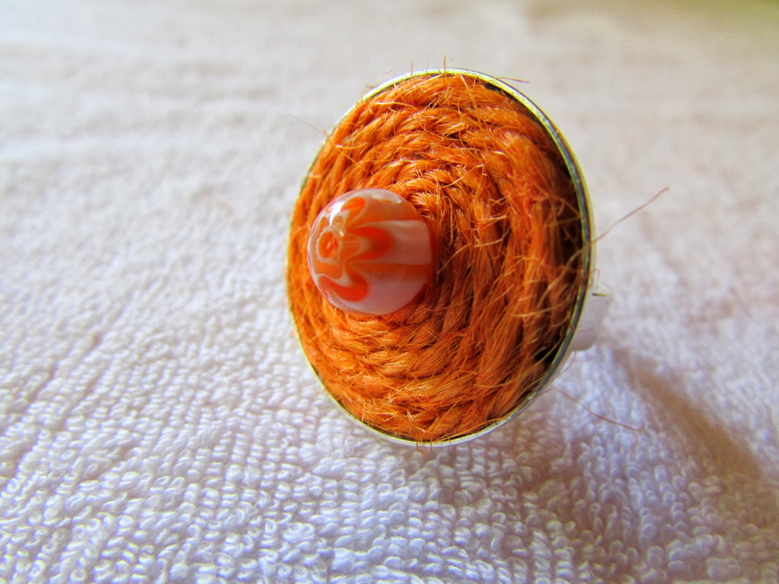 Choose if you are going to use buttons or beads. I have selected a milefiori bead in orange shades. Put glue in your bead and put it in the free spot of your ring.