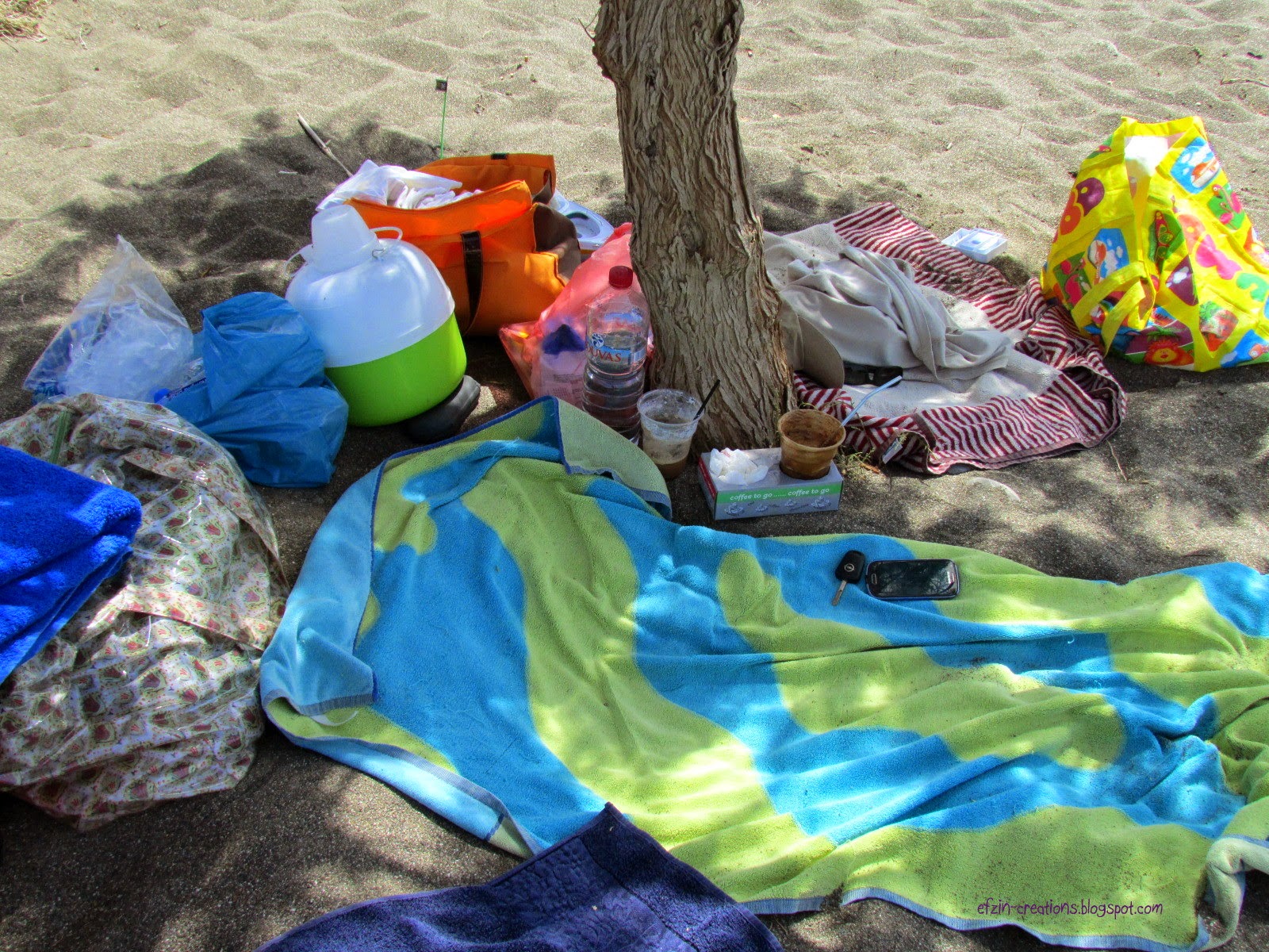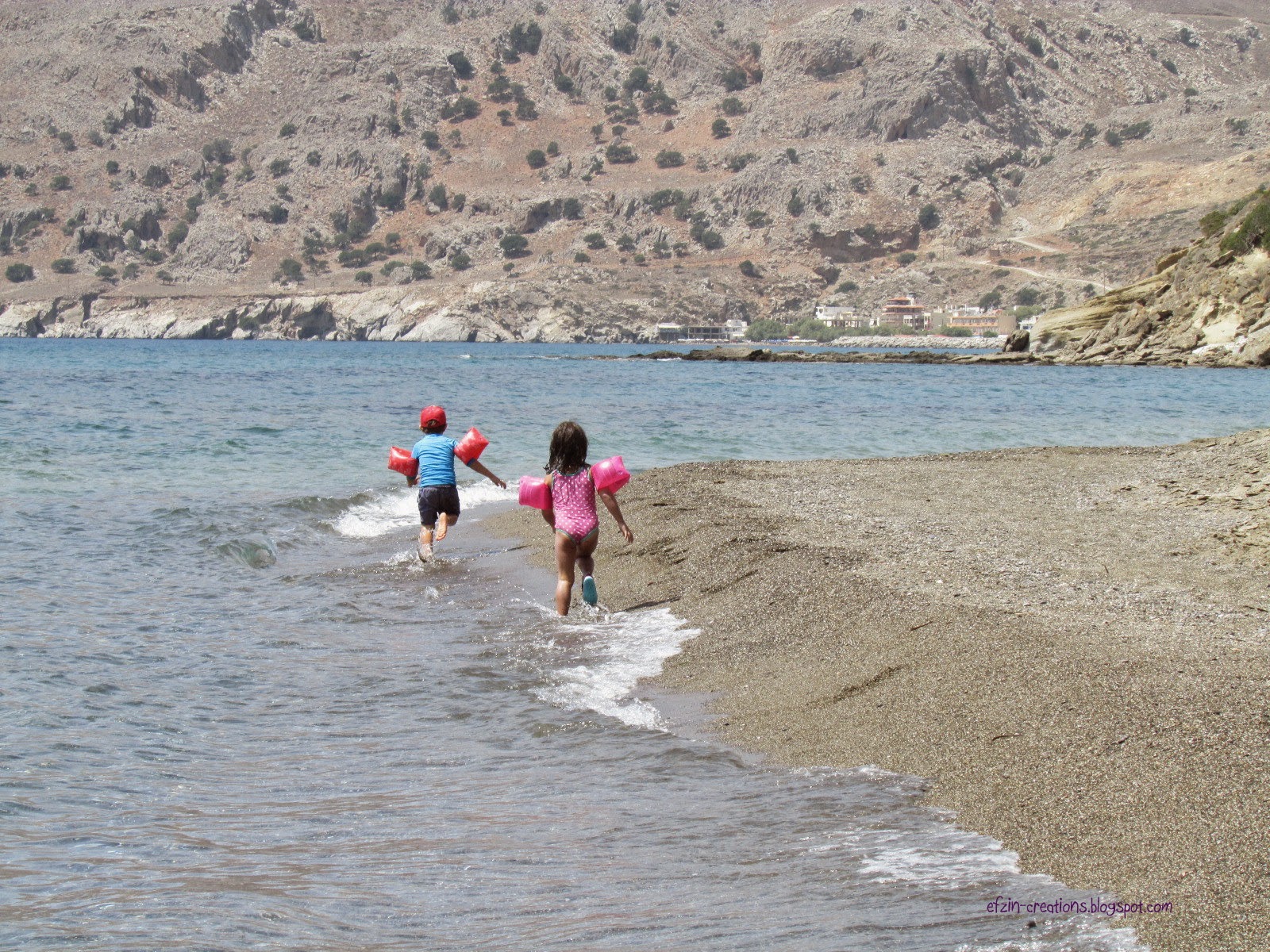 The beach is almost 7km away from Keratokampos and near Tsoutsouros and we had to walk for about 10mins before we got there. Now imagine to do this with 3kids, a baby boy, waters, sun umbrellas, a baby carriage and of course thw necessary stuff for the beach, like towels, food, cloths, extra cloths for the kids, creams, toys etc. Yes, we were crazy!!! The specific day the temperature was almost 41degrees in Crete!!!