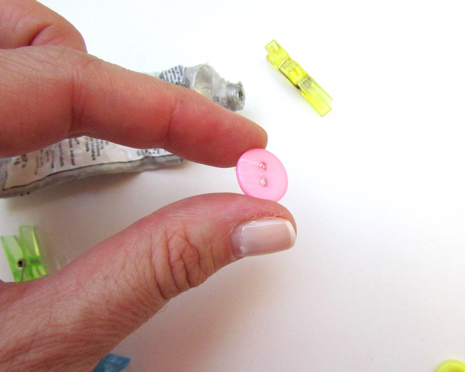 Buttons and tiny colorful clothes pegs… add glue on the buttons and glue it on the pegs…and they are ready!