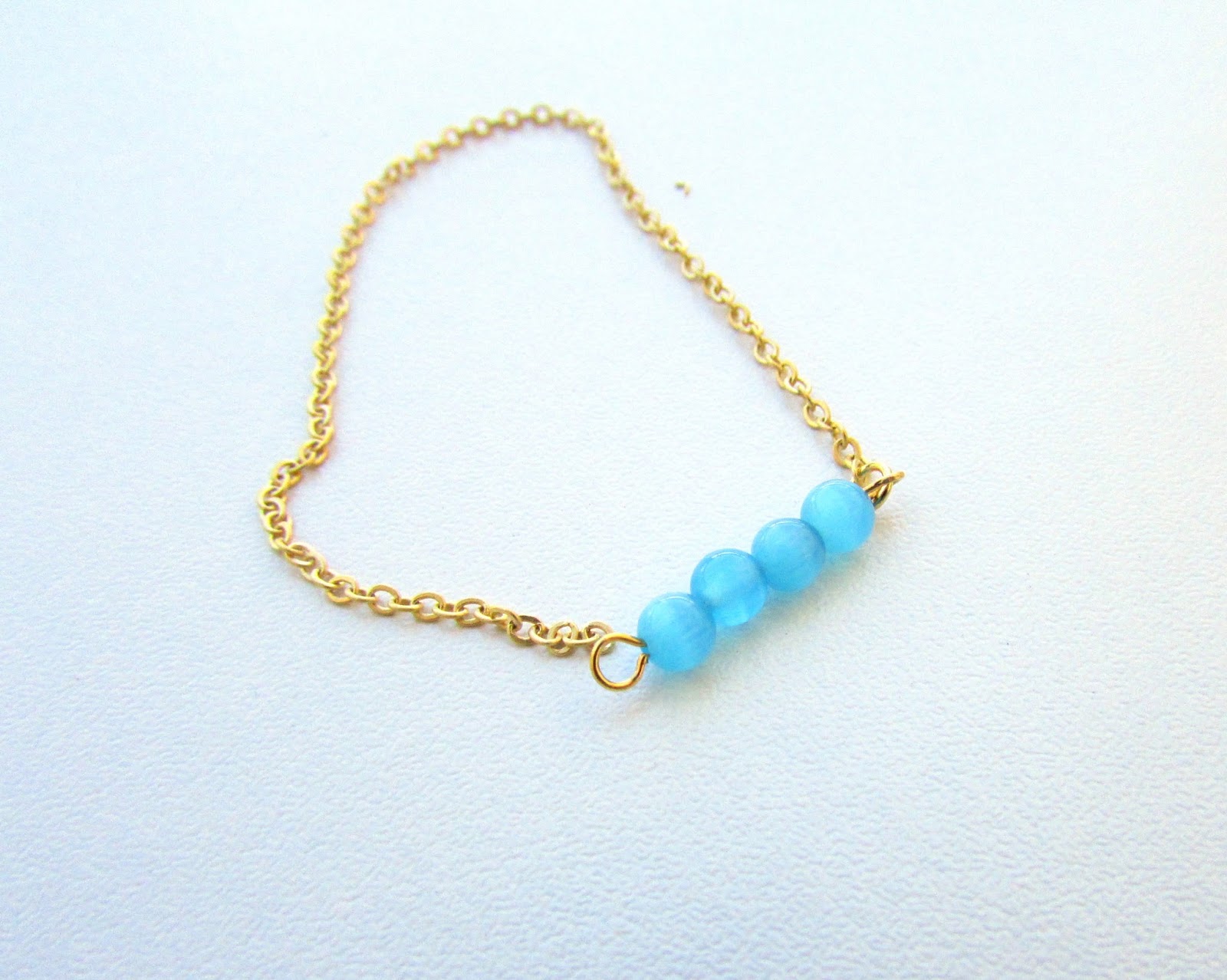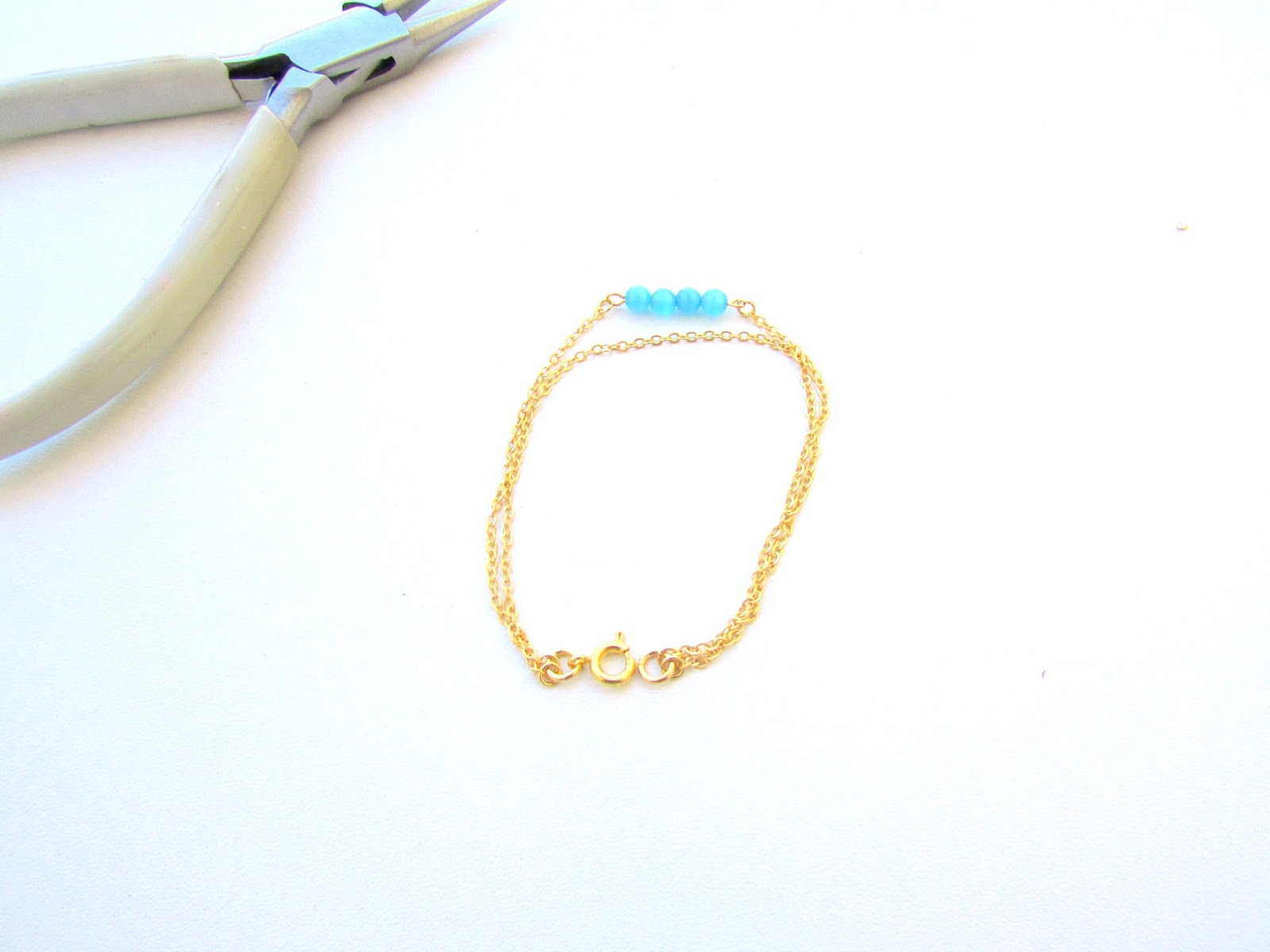 Now, let’s play with the chain and create the first layer of the bracelet. Connect the beaded bar with the end of the gold plated chain. Measure it on your hand and cut a piece of chain that is a little bit smaller.