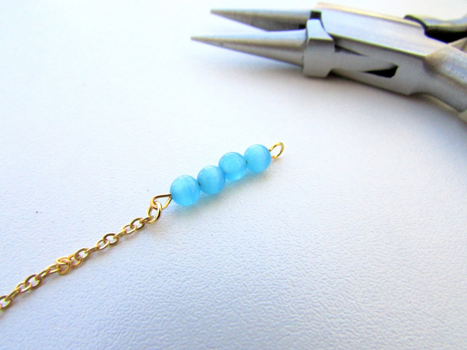 Let’s start by creating the beaded parts. Use the eye pin and pass the jade beads, create a loop on the second end and make a beaded bar. Use also the head pin to make a tiny bead charm with the coral bead.