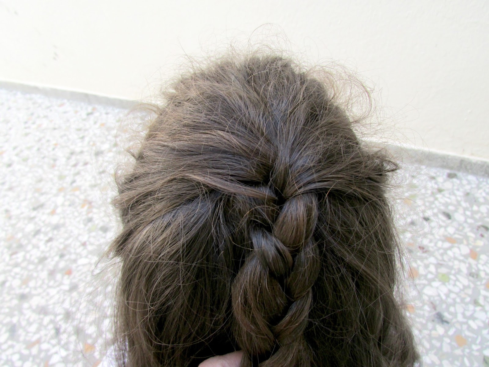So let’s see… First tease the hair and catch a few in the top of the head like trying to make a hair wrath. Start making the classic braid but do not do it until the end. We do only half of the them in a tail and then crab the rest of the hair and make a simple bun.