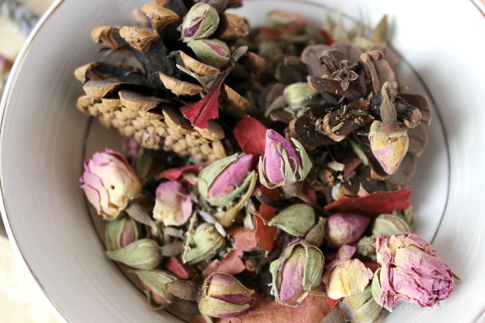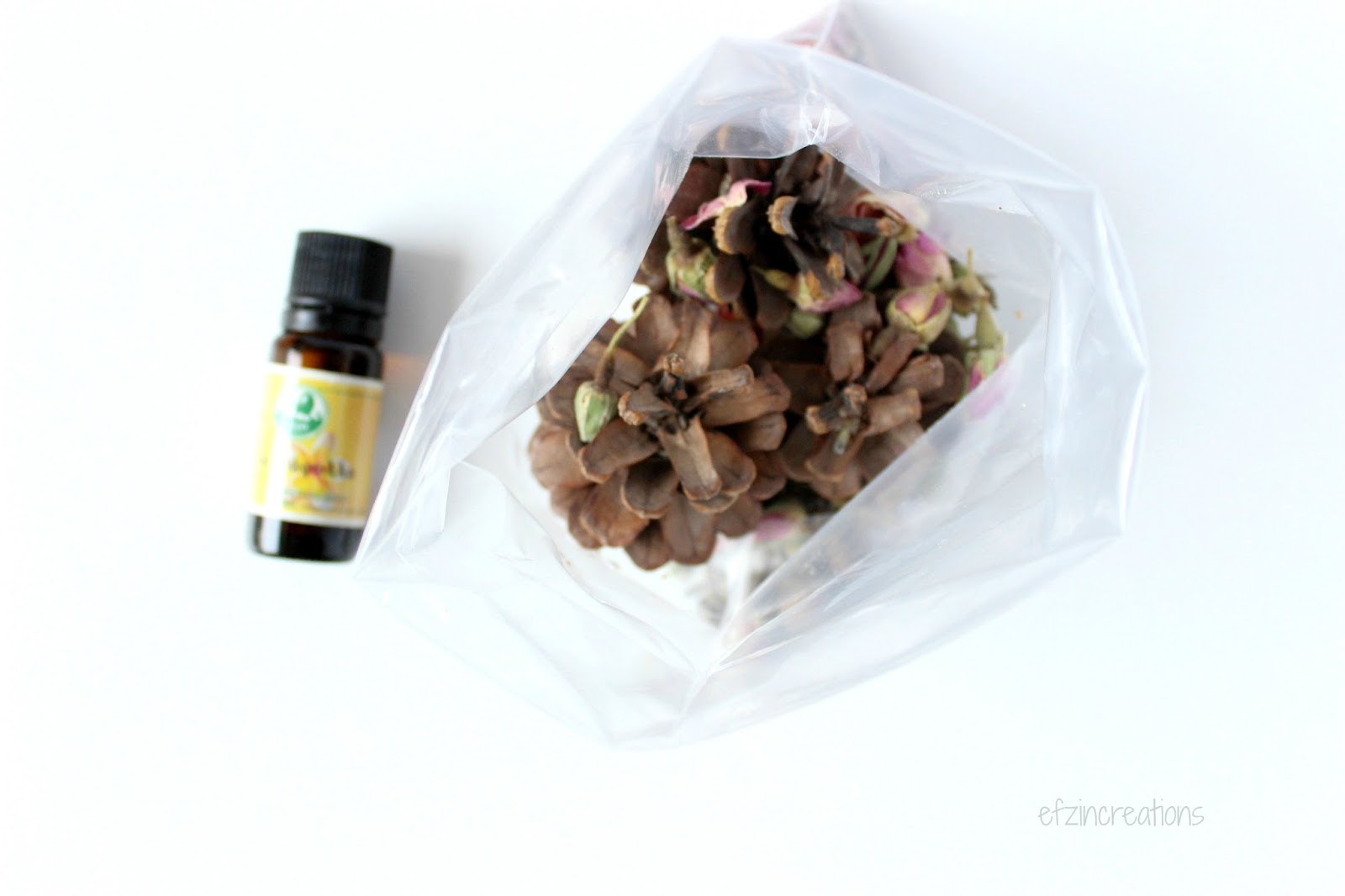 The procedure is really easy! Put all the dried flowers and the lavender and the cloves and the pine cones (or what ever you wish to add and in the quantity you wish) in a small plastic bag. Add 6-8 drops from the essential oil and try to stir them smoothly.