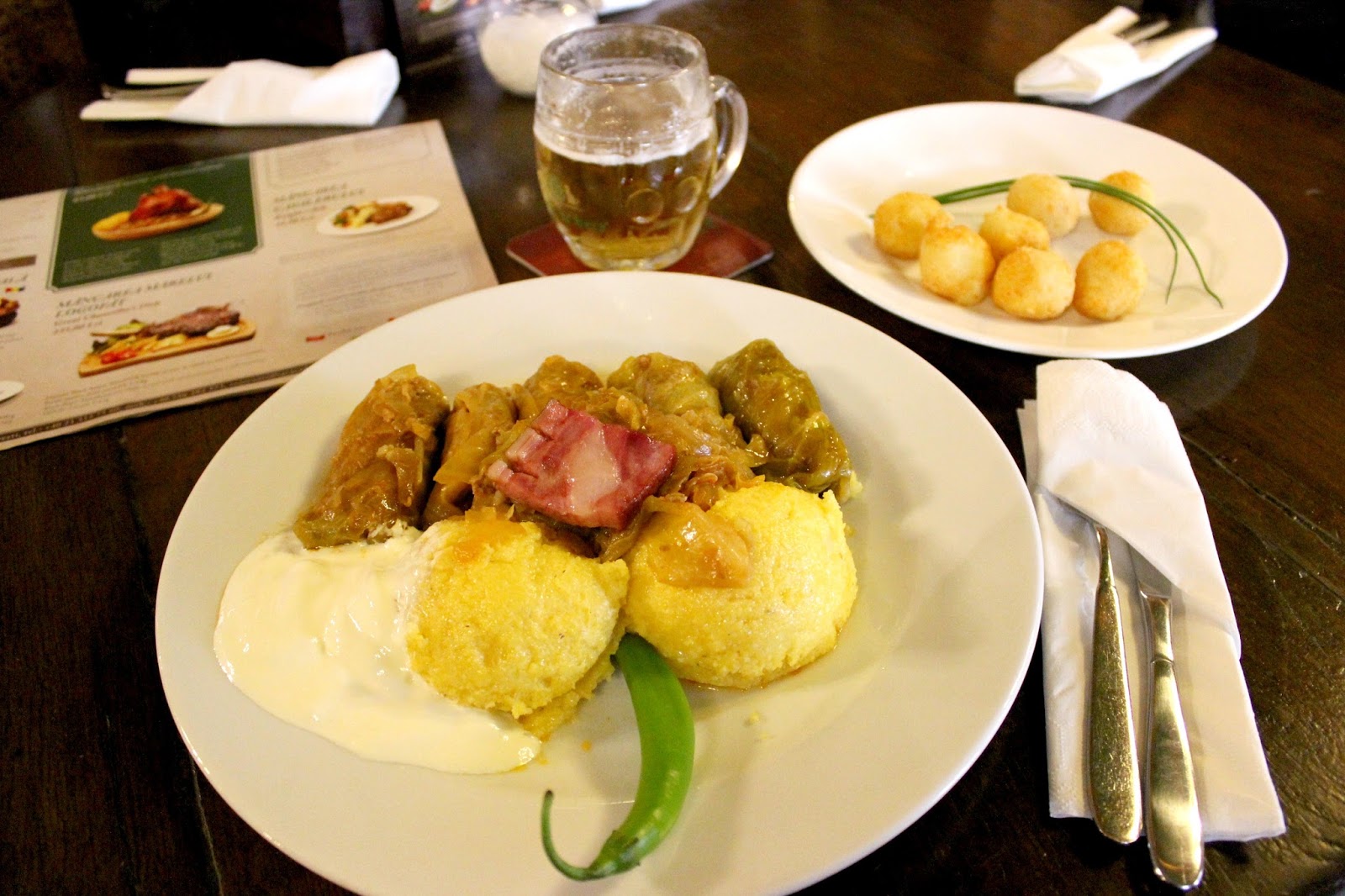 Sarmale cu Mamaliguta for the beginning along with Cheese Dumplings!!! Sarmale is a dish made of rolled minced meat (pork usually) mixed with rice and herbs and covered in cabbage leaves. It is usually accompanied by Mamaliga (or Mamaliguta) – polenta made of boiled corn flour, as well as by hot peppers and sour cream. My dish had also a small piece of Smoked bacon – “Slănina afumată” just to taste it…and it was just enough to make me decide that next time in Bucharest I will try this dish!