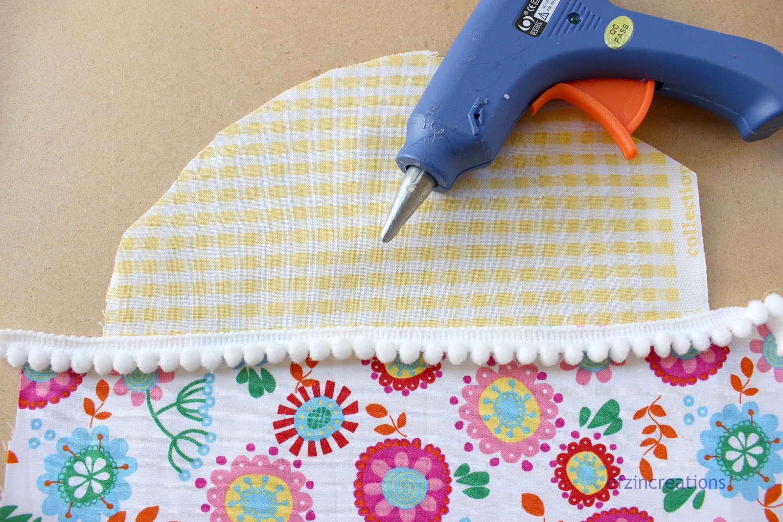 Let’s decorate the pocket with some ribbon. As usual lately I have used a tiny pom pom ribbon I had. Put some hot glue on your ribbon and put it on the edge of the fabric piece that is going to be the pocket. Just be carefull not have glue on the second fabric.