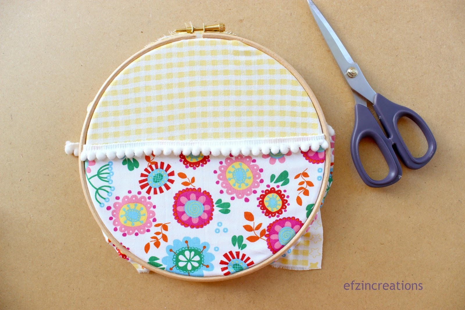 Place your fabrics on the endoidery hoop, close it and cut the remaining pieces around. Your hoop pocket is actually ready!