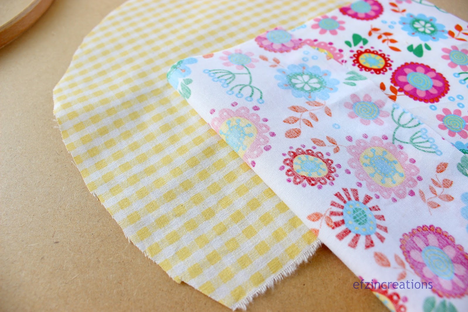 First choose your favorite fabrics. We are going to use two pieces of fabrics, so we may combine different styles of them. I used a plaid one and a floral one. Cut two pieces, a large one a little bit bigger than the hoop’s size and a small one with exactly the same width but at least have in length (the second piece is going to be the pocket, so choose your desired length accordingly).