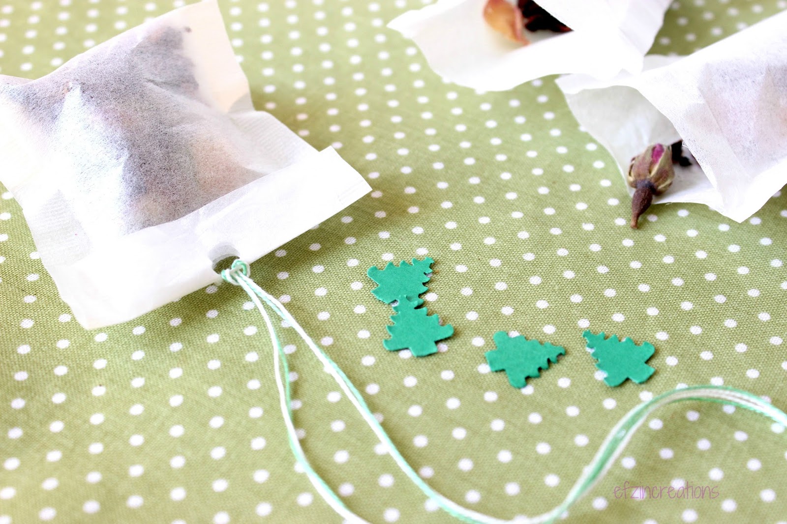 Mix up the dried flowers and the tea in a bowl. Put in the tea bags 1-2 tea spoons of the mixture. Fold the edge and use the pouncer to create a tiny whole. Pass the treads from the whole and glue at the end the tiny Christmas tree from paper. Let it dry. Your tea bags are ready!