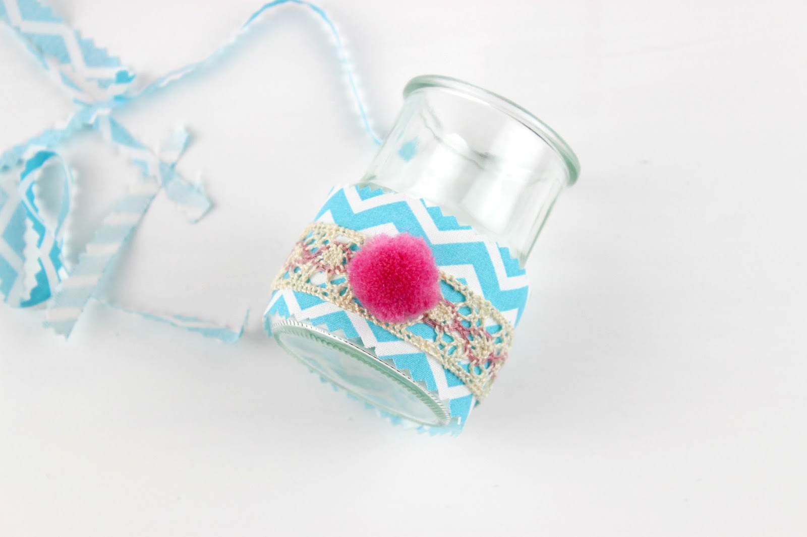 The only thing you need is good mood and fabrics and ribbons! So, choose your favorite fabric and measure the length and the width you wish to have in order to cover the jar (all or part of it). Cut it with a scissor and if you wish to have a beautiful detail, just use a zig zag scissor. Use hot glue and glue it on the jar.