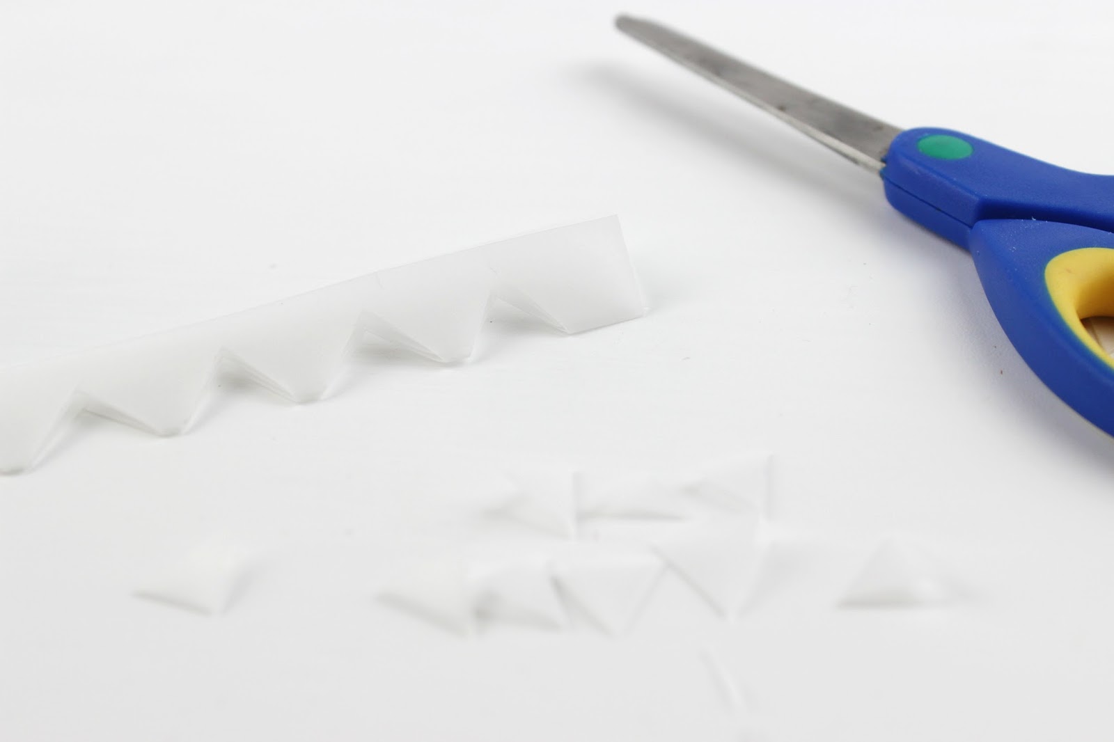 Cut a piece of the rise paper and bend it in the middle. Use your scissor to cut triangles in any size you want. If you want to make them identicall, use a marker first before cutting to draw your triangles or just use the first triangle you cut as the prototype. In my case, I want them to be the same but different at the same time! So no marker and I just start cutting the paper.