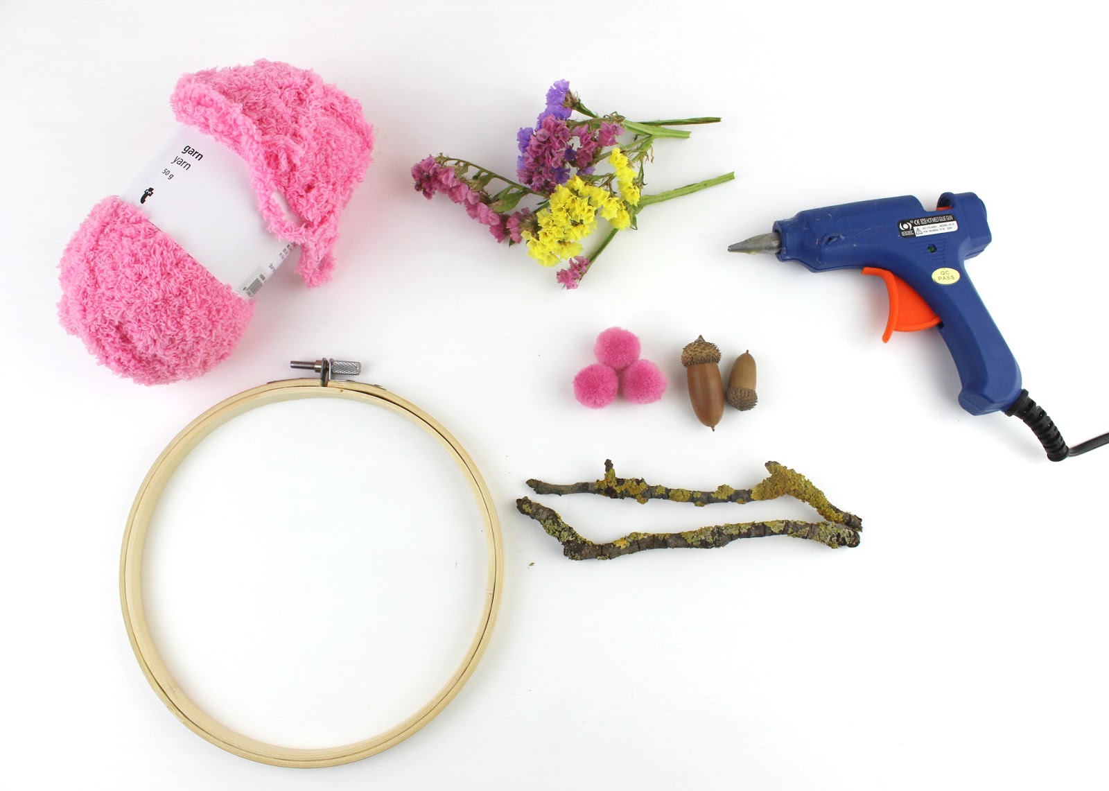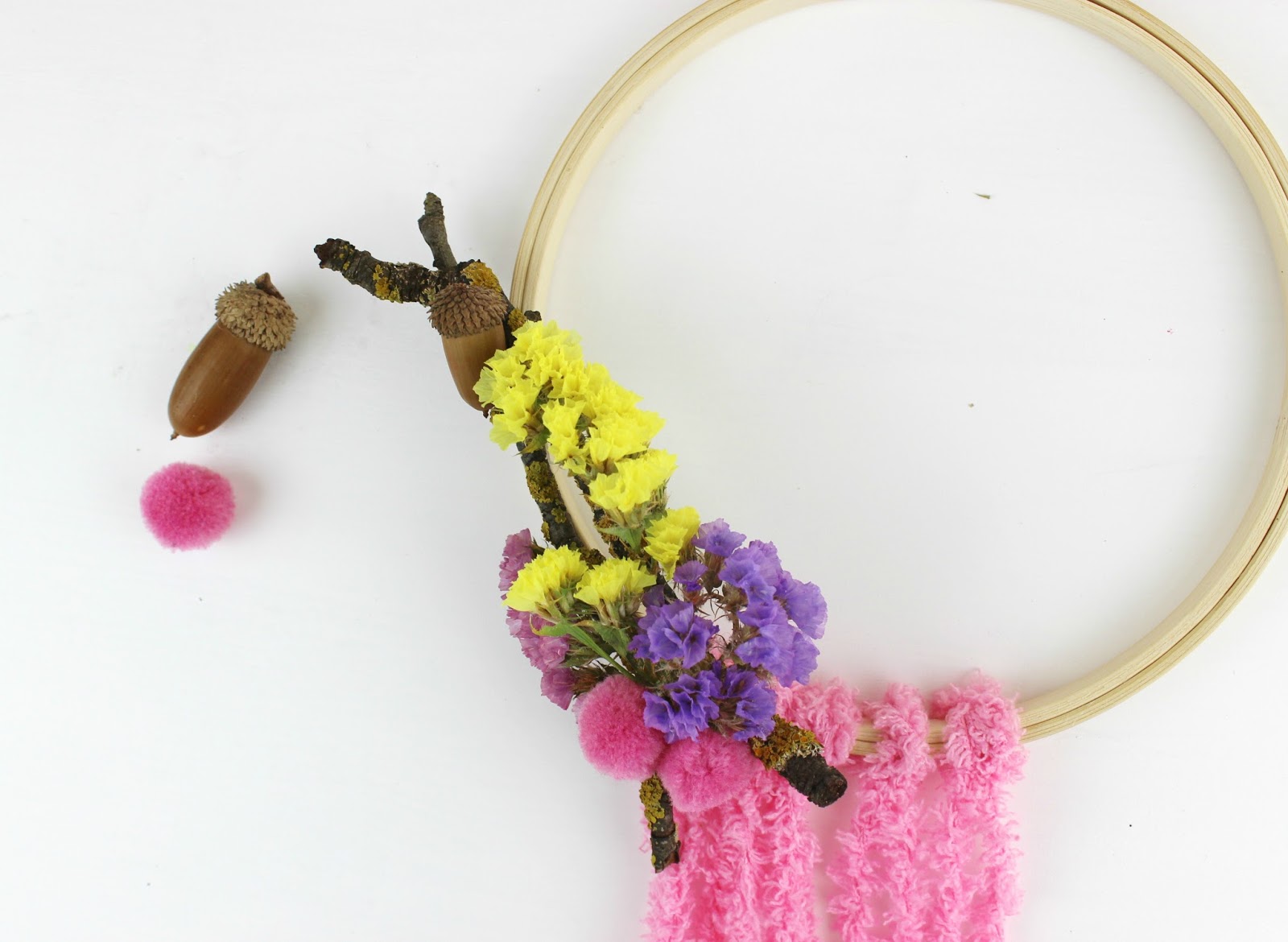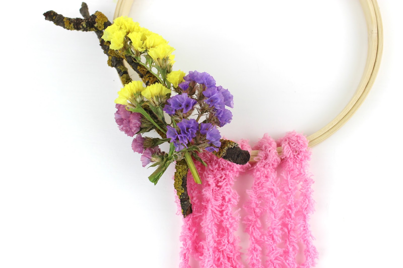 Diy Flower Spring Wreath with embroidery hoop. A beautiful idea to upcycle your embroidery hoop and to create a wreath with flowers and natural materials