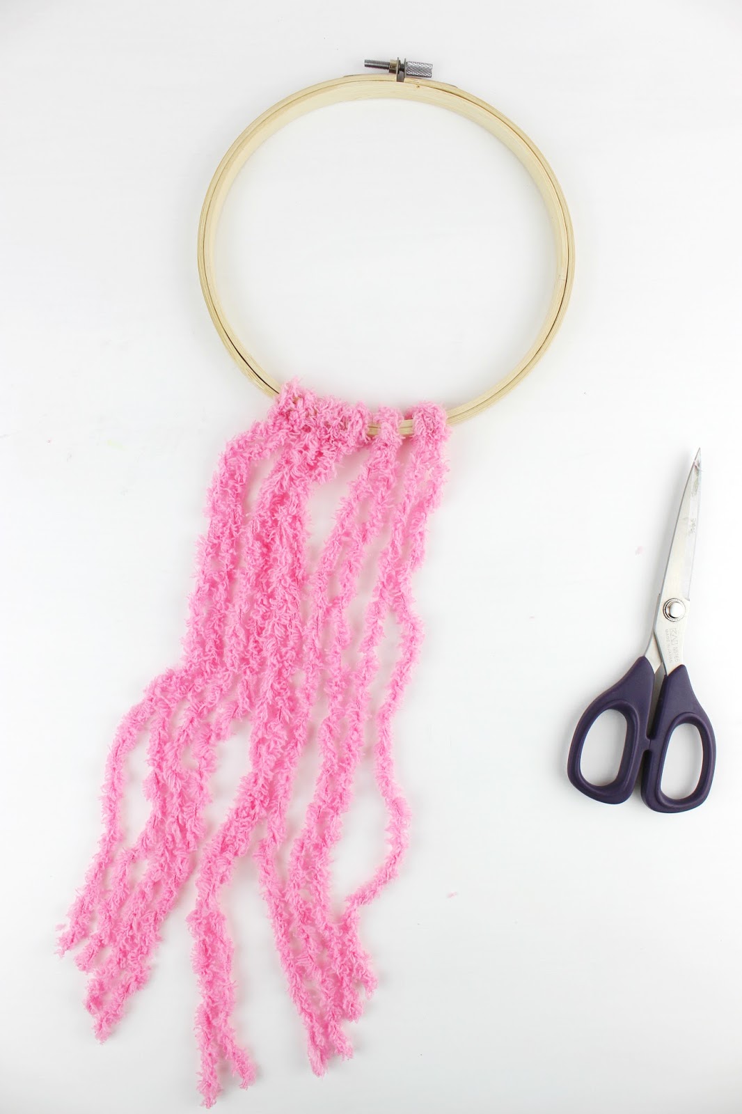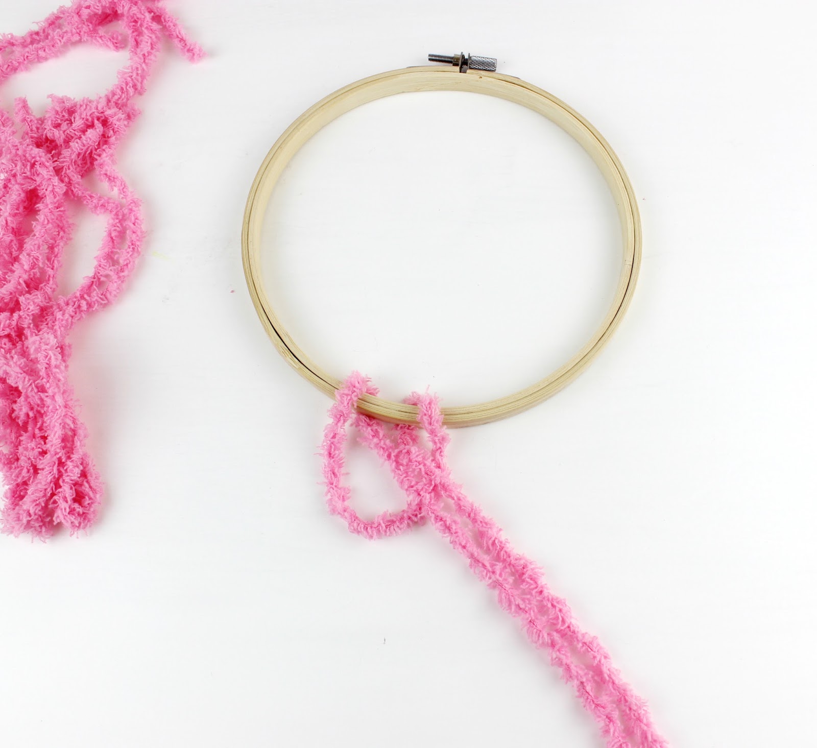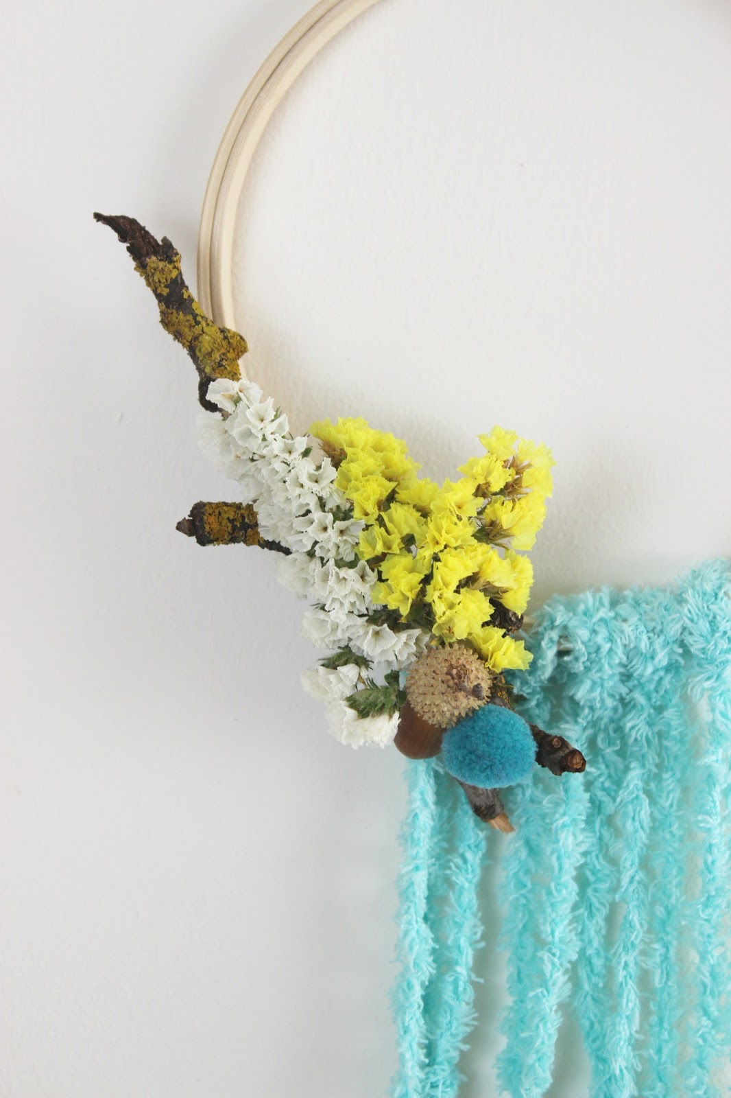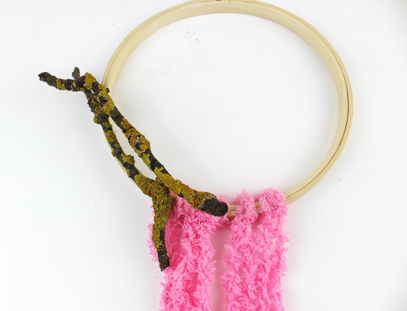 Since my wreath is created it to stay more than a month in my home decoration, I made it a little more cute… you know… with my beloved pom pom! First cut a few scraps of the yarn and make a simple knot on the hoop.