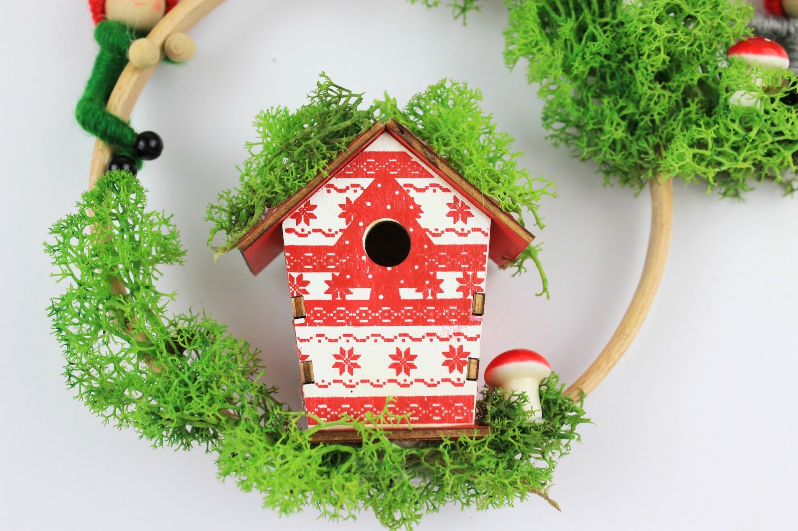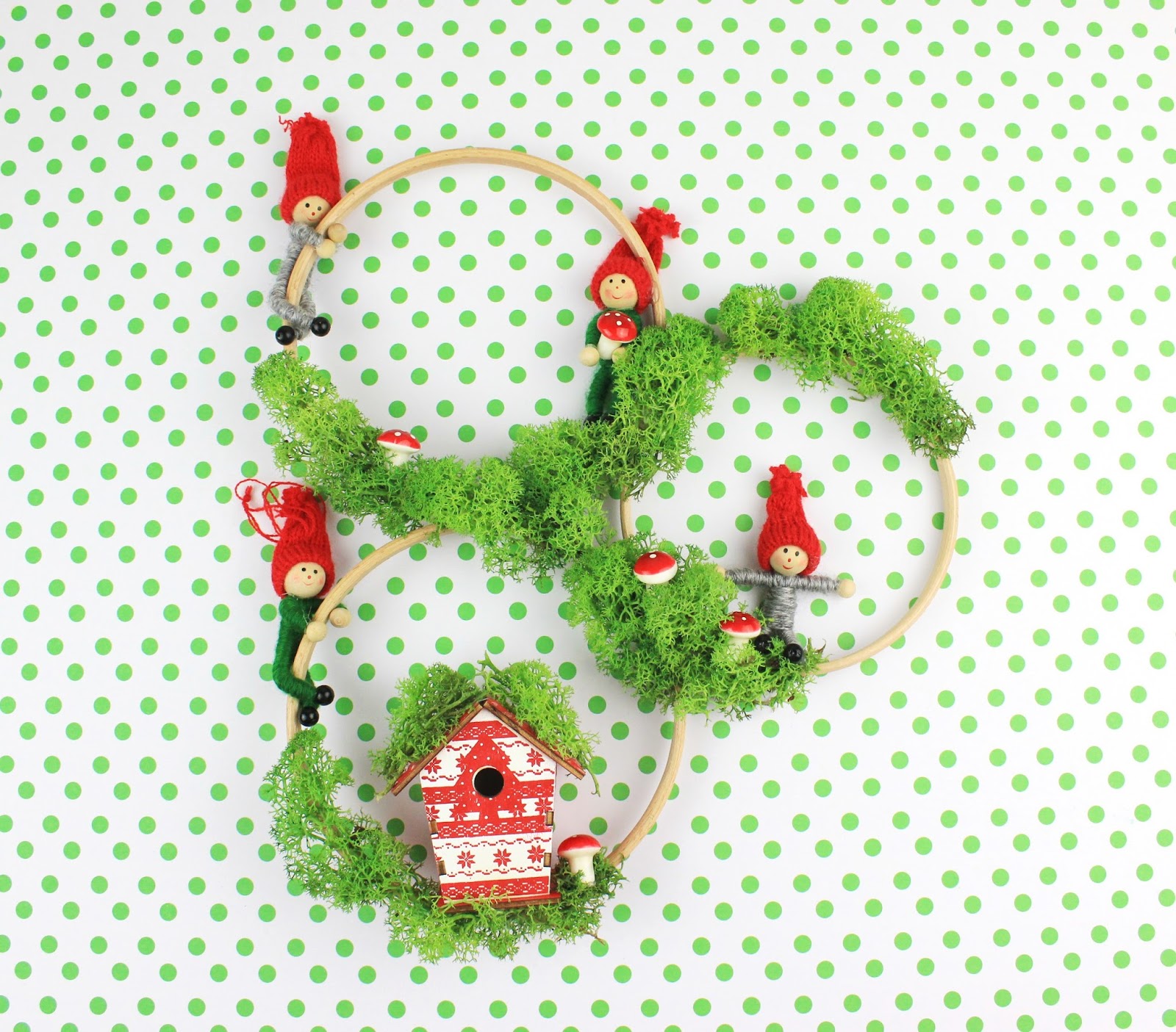 And now let’s start with the funny part…the decoration. Just close your eyes and imagine you are in a forest full of moss and mushrooms and woods and colors! suddenly you discover a tree, with gnomes on its branches! The gnomes are having fun and they laugh and play! Ok, you got it…noe open your eyes and start decorating your hoops with moss and hot glue!