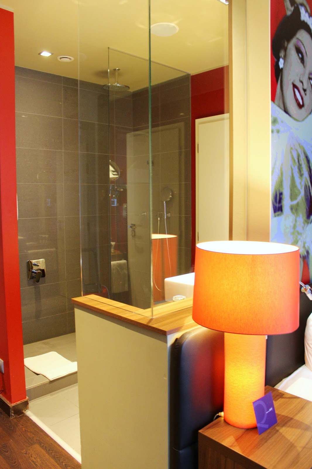 My room was simply adorable and totally my style! Minimal, with bold colors and  beautiful details in retro style, with the most amazing bath I have ever seen and a very comfortable bed! Orange, black and brown with red inputs were the main colors color in the decoration. The lighting was one of the best I had in a hotel because I really liked these minimal lamps! And the bath??? I have never seen something similar so far, since it was pure with glass, meaning you have a view of the bath from the room and vise versa.