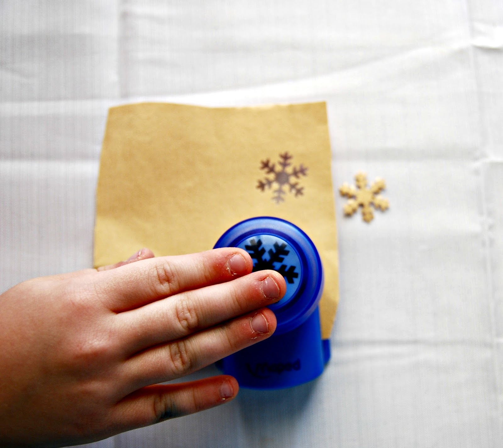 Κόβουμε χιονονιφάδες με το χρυσό χαρτί και το περφορατέρ και τις κολλάμε στο στέμμα στο σημείο που είναι τα συρραπτικά. Αν θέλουμε βάζουμε περισσότερες χιονονιφάδες και…
