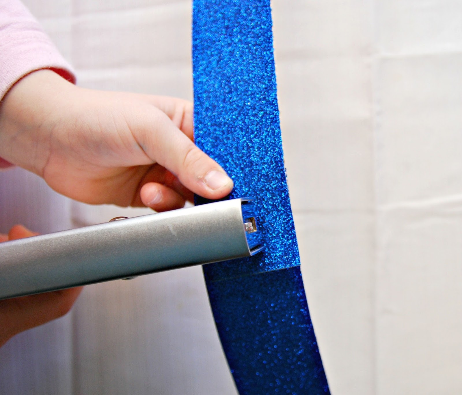 Για να φτιάξουμε τη βάση από το στέμμα μετράμε το κεφαλάκι του παιδιού και ενώνουμε τις δύο λωρίδες στο επιθυμητό μέγεθος, με συρραπτικό.