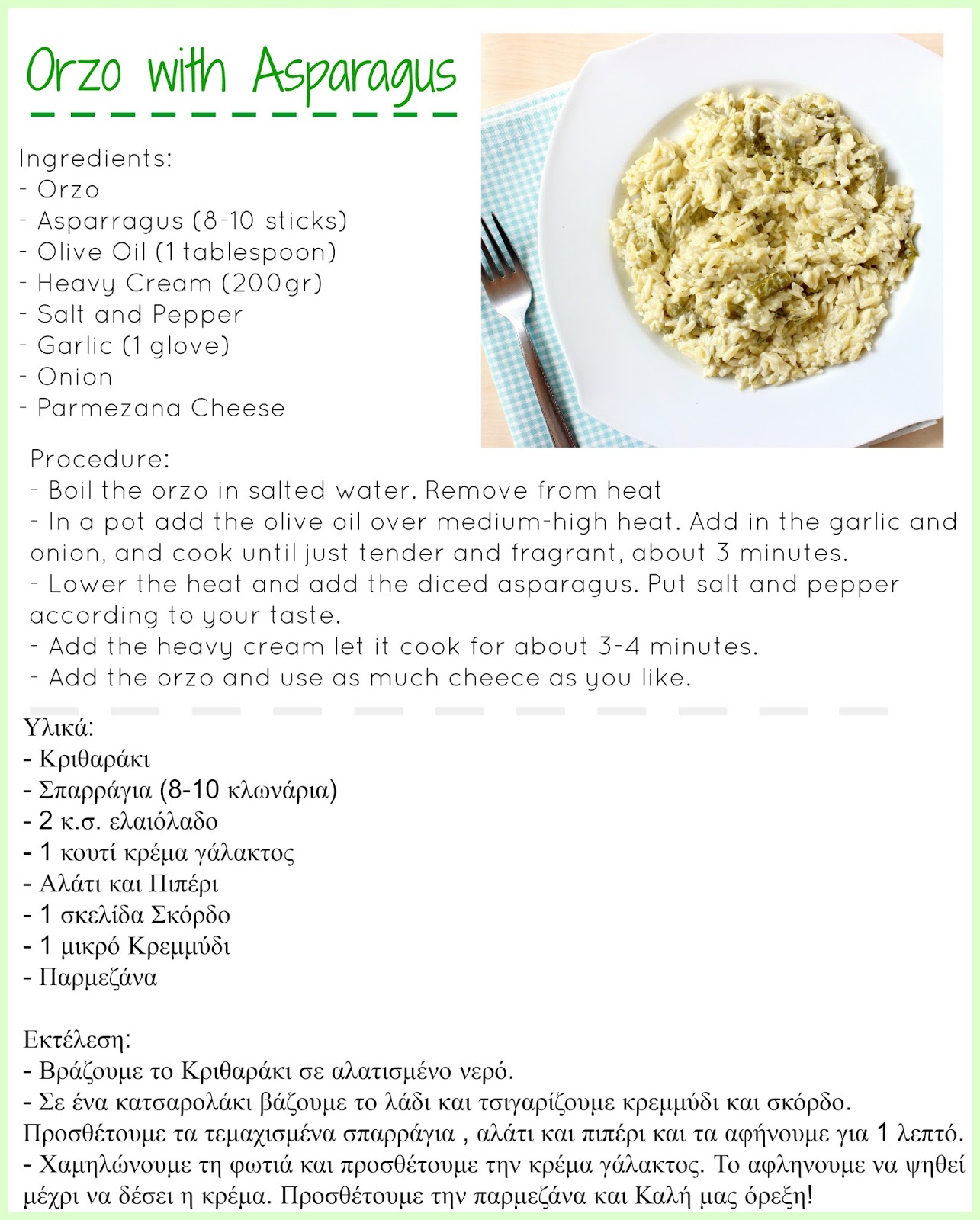 Όπως και να έχει, μετά από ένα ποτήρι κρασί, δε μπορείς να φανταστείς τι φοβερή φαντασία έχεις! Οπότε κρέμα γάλακτος και σκόρδο και κριθαράκι και έτοιμο το νοστιμο κριθαρότο! Ο καλός μου το δοκίμασε (ναι…ναι…ειναι δοκιμαστής των πειραμάτων μου…) και το λατρεψε! Τελεια! Οπότε η συνταγη μου έμεινε και την απολαμβάνουμε κάθε φορά που βρίσκω φρεσκα σπαράγγια μαζί φυσικά με ένα μπουκάλι λευκό κρασι! Κριθαρότο κανεις λοιπόν;