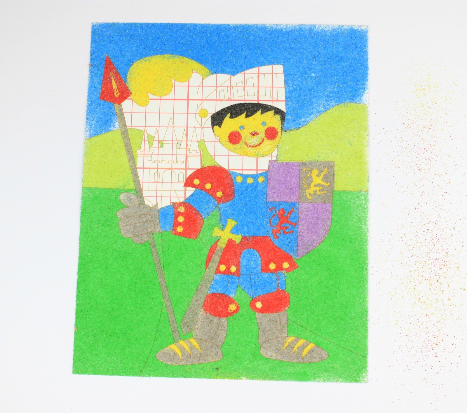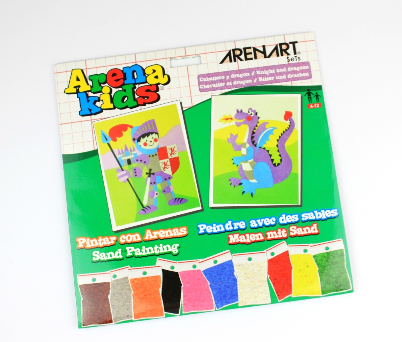 Το πακέτο περιλαμβάνει 2 σχέδια πάνω σε αυτοκόλλητο χαρτί, 10 διαφορετικά χρώματα άμμου και ένα κοπίδι. Αυτή τη φορά επιλέξαμε κάτι με πιο αγορίστικο θέμα, οπότε Ιππότης και Δράκος (ναι, είμαστε φανατικοί των δράκων και των δεινοσαύρων!).