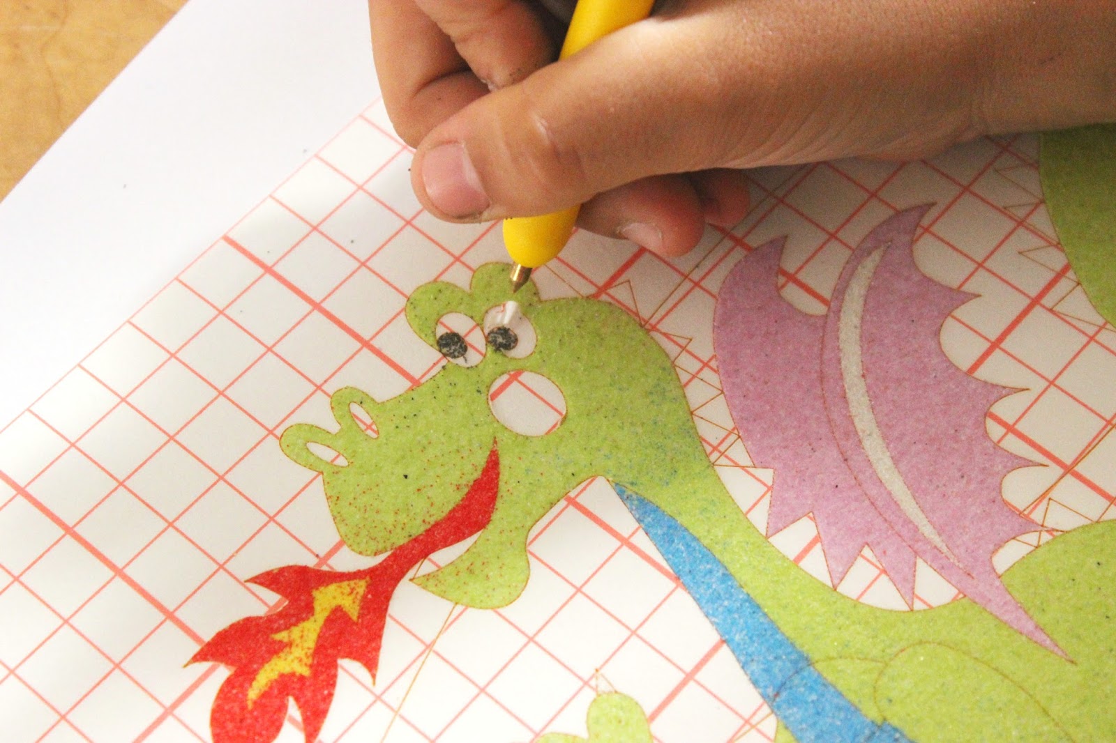 Η διαδικασία απλή. Αρχικά με το κοπίδι αφαιρέστε το χαρτί πάνω στο μέρος του σχεδίου που θέλετε να χρωματίσετε και ρίξτε άμμο. Με τα χέρια απλώστε καλά την άμμο ώστε να καλυφθεί όλο εκείνο το σημείο και αφαιρέστε την περισσευούμενη. Συνεχίζουμε έτσι μέχρι να ολοκληρωθεί το σχέδιο.